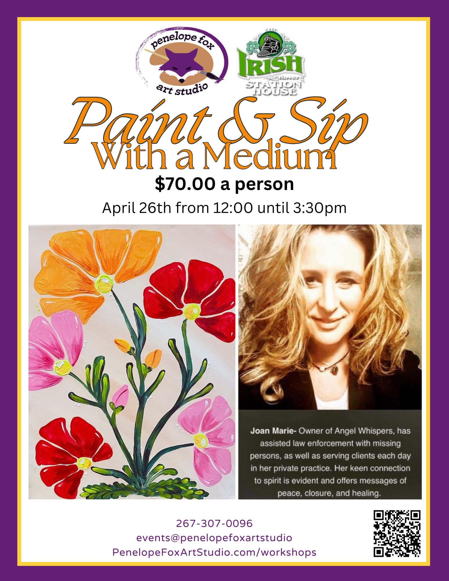 During this special event, Joan Marie of Angel Whispers—known for assisting law enforcement in missing person cases and helping clients find peace and closure—will share intuitive insights while you paint. This event blends art, creativity, and spiritual connection for a memorable afternoon with friends.